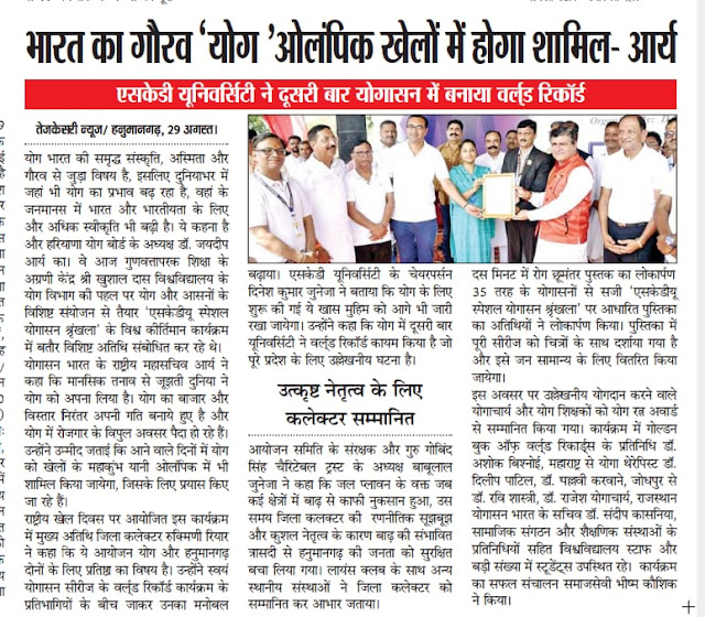 हनुमानगढ़ में राष्ट्रीय खेल दिवस पर ‘एसकेडीयू स्पेशल योगासन श्रृंखला’ कार्यक्रम का आयोजन किया गया। इस कार्यक्रम में जिले भर से युवा, महिला, पुरुष और सरकारी कर्मियों ने योग कार्यक्रम में भाग लिया। दरअसल, एसकेडी यूनिवर्सिटी द्वारा योग और आसनों के विशिष्ट संयोजन से "10 मिनट में रोग छूमंतर" की थीम पर तैयार स्पेशल योगासन श्रृंखला बनाई गई। ये श्रृंखला 35 तरह के योगासनों का संयोजन है जिसे केवल 10 मिनट की समय अवधि में पूरा किया जा सकता है। 35 तरह के योगासनों से सजी ‘एसकेडीयू स्पेशल योगासन श्रृंखला’ पर आधारित पुस्तिका का अतिथियों ने लोकार्पण किया। पुस्तिका में पूरी सीरीज को चित्रों के साथ दर्शाया गया है और इसे जन सामान्य के लिए वितरित किया जाएगा। इस मौके पर उल्लेखनीय योगदान करने वाले योगाचार्य और योग शिक्षकों को योग रत्न अवार्ड से सम्मानित किया गया।
